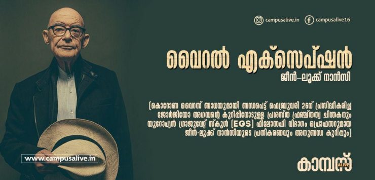 2020 ഫെബ്രുവരി 26ന്, ലോകാരോഗ്യ സംഘടനയും മറ്റുള്ളവരും പറയുന്നതനുസരിച്ച്, നിലവിലുള്ള ആഗോള പകർച്ചവ്യാധിയുടെ വക്കിലെത്തിയ കൊറോണ വൈറസ് പൊട്ടിപ്പുറപ്പെടുന്നതിനെക്കുറിച്ച് ഇറ്റാലിയൻ തത്ത്വചിന്തകനായ ജോർജിയോ അഗമ്പൻ ഐൽ മാനിഫെസ്റ്റോയിൽ ഒരു ഹ്രസ്വ പ്രതികരണം പ്രസിദ്ധീകരിച്ചിട്ടുണ്ട്. പൊസിഷൻസ് എന്ന വാർത്താപത്രികയുടെ വെബ് സൈറ്റിൽ അഗമ്പന്റെ ലേഖനത്തിന്റെ ഇംഗ്ലീഷ് വിവർത്തനം “ദി സ്റ്റേറ്റ് ഓഫ് എക്സെപ്ഷൻ പ്രൊവോക്ഡ് ബൈ ആൻ അൺമോട്ടിവേറ്റഡ് എമർജൻസി” (കൊറോണ: ഭരണകൂട നടപടികളുടെ രാഷ്ട്രീയം)എന്ന പേരിൽ നിങ്ങൾക്കത് വായിക്കാം. ഒരു ദിവസത്തിനുശേഷം, ഫെബ്രുവരി 27ന്, അഗമ്പനോട് ഒരു ചെറിയ പ്രതികരണം എന്നോണം ആന്റിനോമി വെബ്സൈറ്റിൽ ഫ്രഞ്ച് തത്ത്വചിന്തകനായ ജീൻ-ലൂക്ക് നാൻസിയുടെ “വൈറൽ എക്സെപ്ഷൻ” എന്ന കുറിപ്പ് ഇറ്റാലിയൻ, ഫ്രഞ്ച് ഭാഷകളിലായി പ്രസിദ്ധീകരിക്കപ്പെട്ടു. ഇതിന്റെ ഇംഗ്ലീഷ് പരിഭാഷയാണ് താഴെ.
